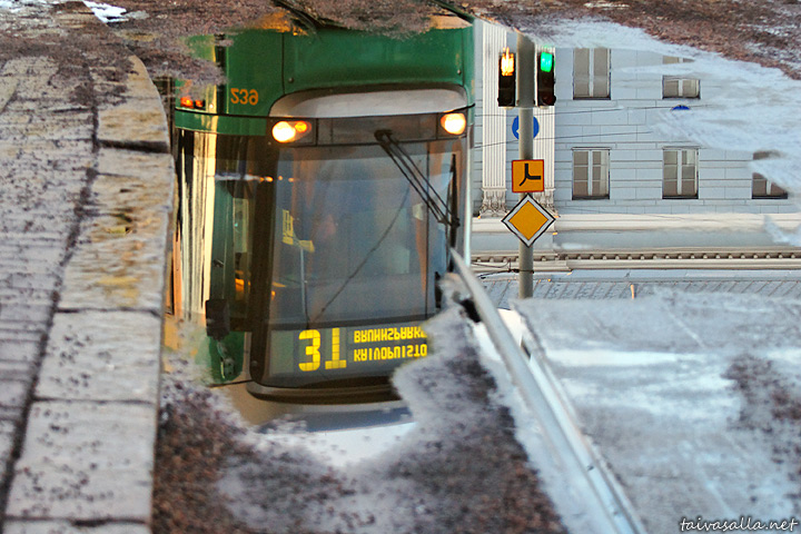 Kuvan tekee erikoisen kummalliseks se, että etualan "oikea" katu on epäselvempi kuin heijastuskuvan ratikka ja sininen rakennus. Ratikka pyrkii maan alta hiekan läpi esiin ja on ylösalas. Kiitos hämmästyksestä!
