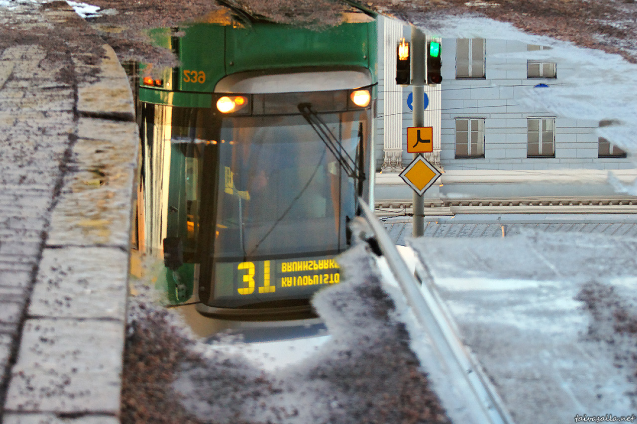 Helsinki: Matalalattiaratikan heijastus kevätauringon synnyttämässä lätäkössä Etelärannassa.