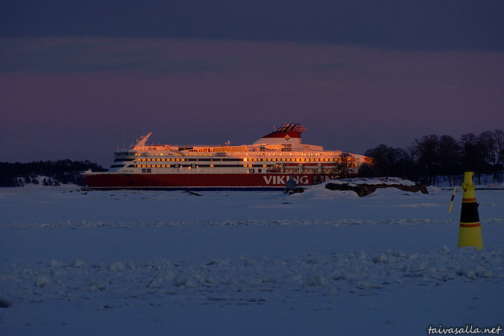 Helsinki: Laskevan auringon valaisema Viking XPRS jäisellä Kruunuvuorenselällä Suomenlinnan lähettyvillä. Eteläsatamaan suuntaava alus on kuvattu Ehrenströmintieltä Kaivopuistosta.