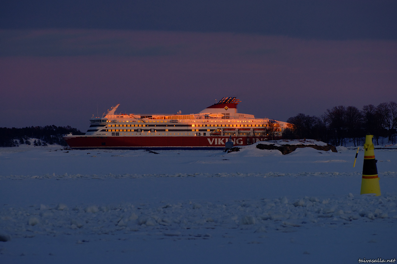 Helsinki: Viking XPRS approaching the South Harbour in wintry conditions. The setting sun lights up the ship in this view from the shore of Kaivopuisto district.