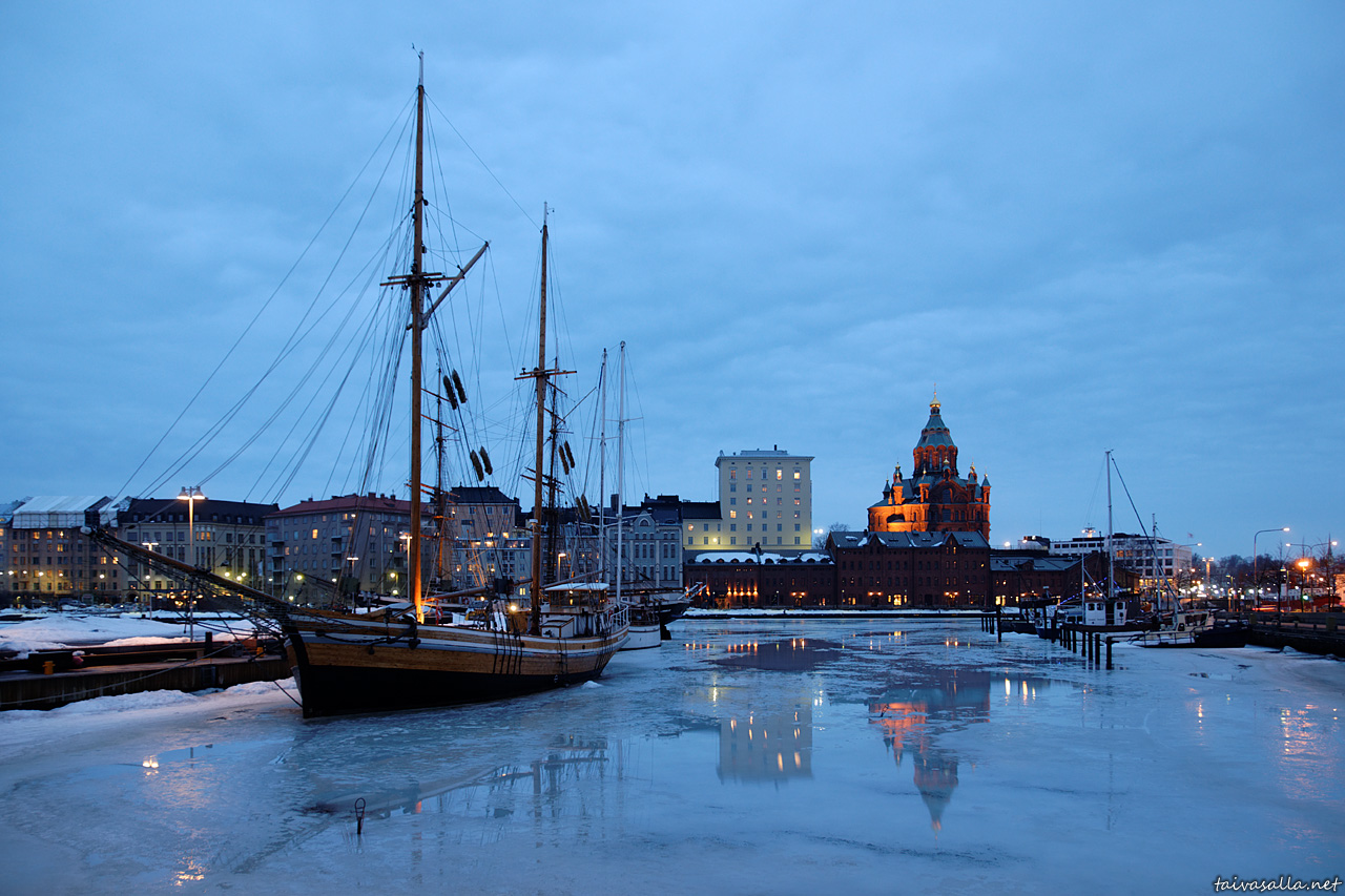 Helsinki: Hämärtyvän kevätillan näkymä Pohjoissataman Halkolaiturilta Kruununhaan edustalta kohti Katajanokkaa.