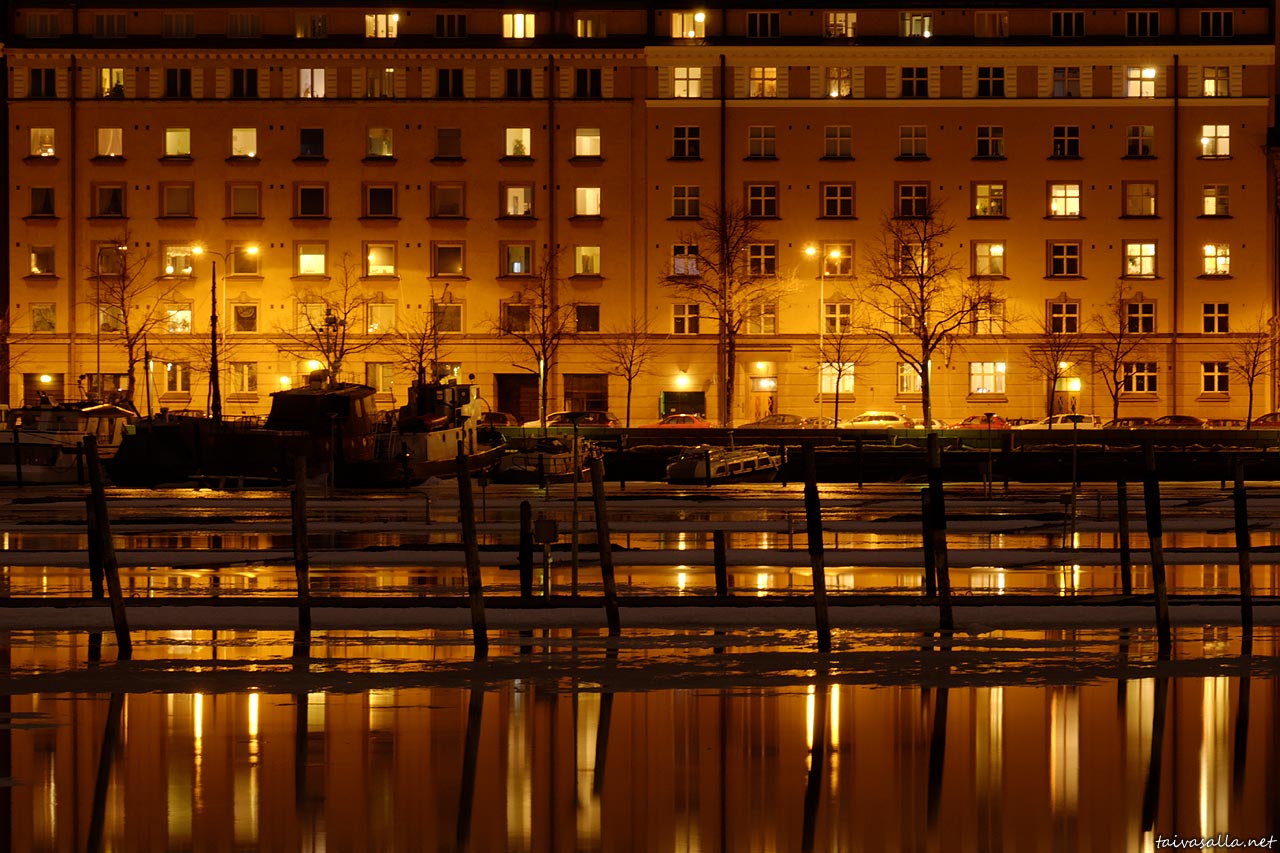 Minusta kuva on todella hieno viivojen ja neliöiden sommitelma, valot ja heijastukset vielä tehostavat sen rytmiä. Sulava jää ja lämmin valaistus tunnelmallisia.