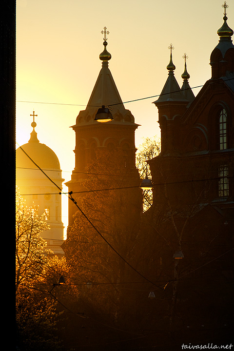 Helsinki: Tuomiokirkko, Uspenskin katedraali ja Katajanokan puisto laskevan auringon kullanhohtoisessa valossa. Kuvattu vastavaloon Kruunuvuorenkadulta Katajanokalta.