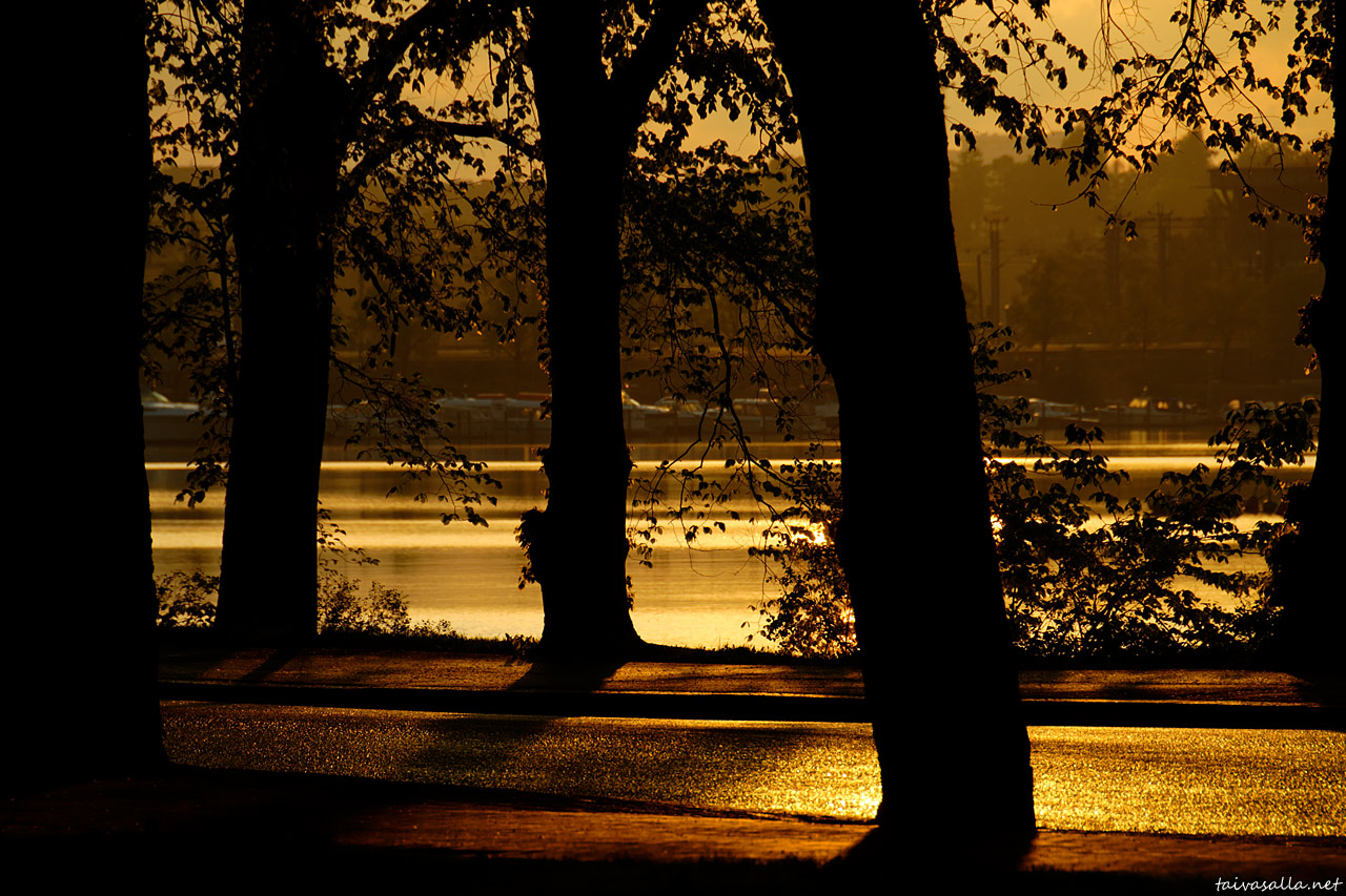 Sateen jälkeen aurinko päällysti kadun pronssilla.