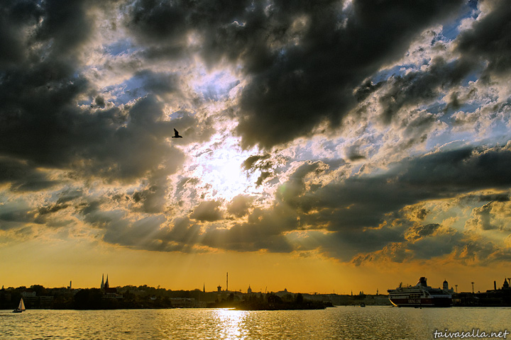 Helsinki: Kevätillan näkymä kohti Eteläsatamaa Suomenlinnan lautalta Kruunuvuorenselältä.