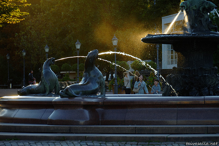 Helsinki: Havis Amandan merileijonien vesisuihkut loistavat ilta-auringossa Kauppatorin laidalla.