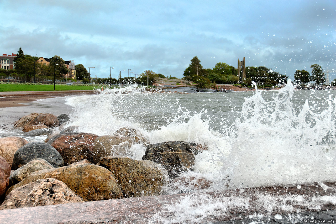 Tiina, Aiu ja Kaija, kiitos kommenteistanne! Eipä tuo myrsky tosiaan kummoinen täällä Helsingissä ollut, ja jouduinkin suorastaan etsiskelemään paikkaa jossa hieman pärskisi. Kaivopuistosta näkyi että ulkosaaristossa laineet murtuivat näyttävästi osuessaan rantakallioihin. Olisinpa ollut Hangossa, jossa myrsky oli varmaan hieman vaikuttavampi.
