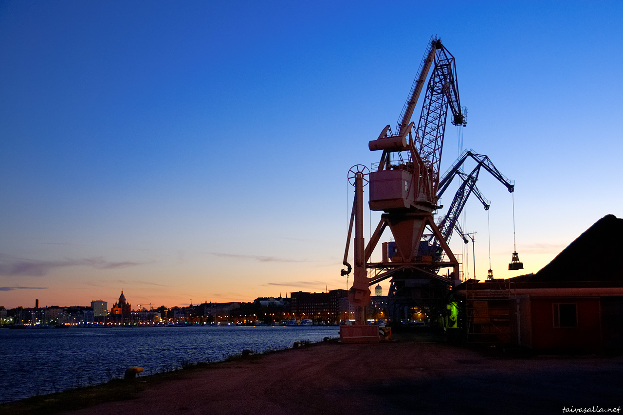 Helsinki: Hanasaaren voimalaitoksen kivihiilinosturit Hanasaaren laiturilla Sörnäisten satamassa. Kuvattu syysillan hämärissä kohti Kruununhakaa, Pohjoissatamaa ja Katajanokkaa.