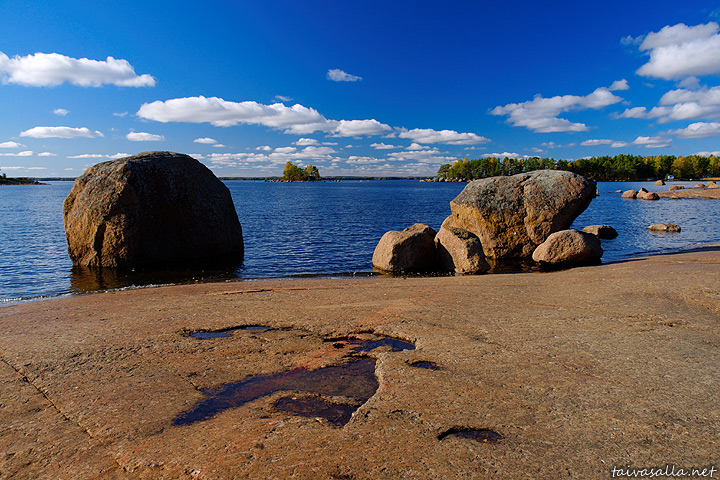 Kotka: Aurinkoisen syyspäivän näkymä Santalahden luontopolun varrelta Mussalosta.