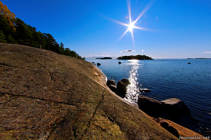 Kotka: Aurinkoisen syyspäivän näkymä Santalahden luontopolun varrelta Mussalosta.
