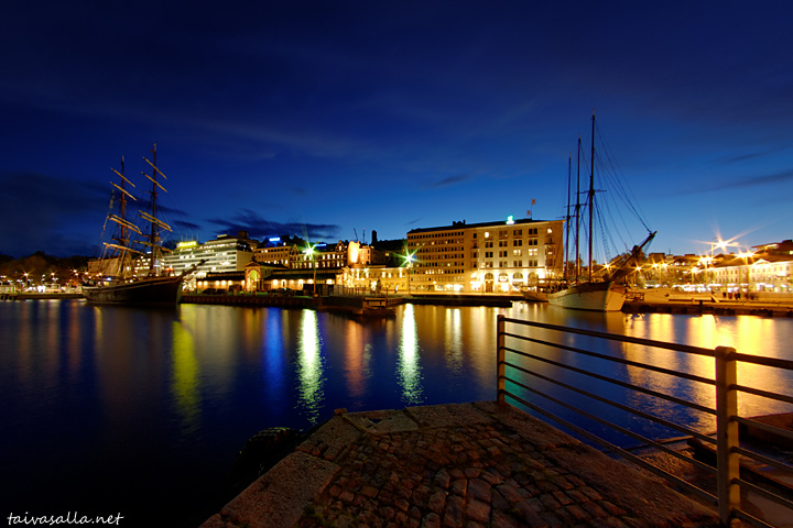 Tummansinistä taivasta vasten priki Gerdan raakapuut ( valitettavasti ihan en ole varma sanavalinnastani, kun niin huonosti tunnen purjelaivoja ) näkyvät tosi hyvin. Kerrassaan hieno ja jotenkin romanttinen kuva...sataman valot ne siinä!