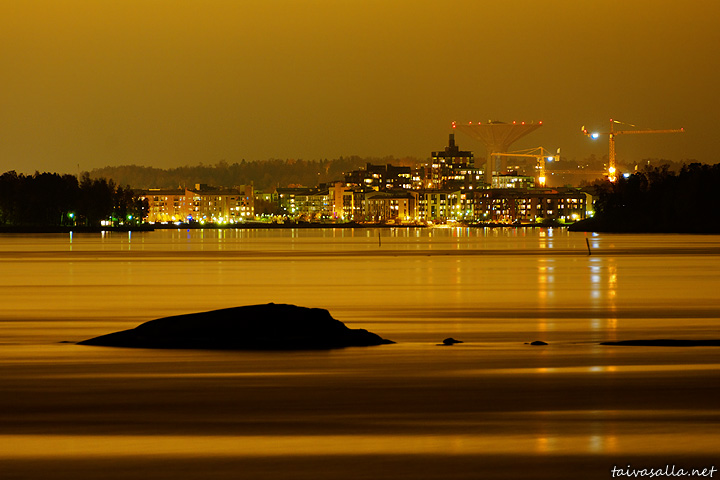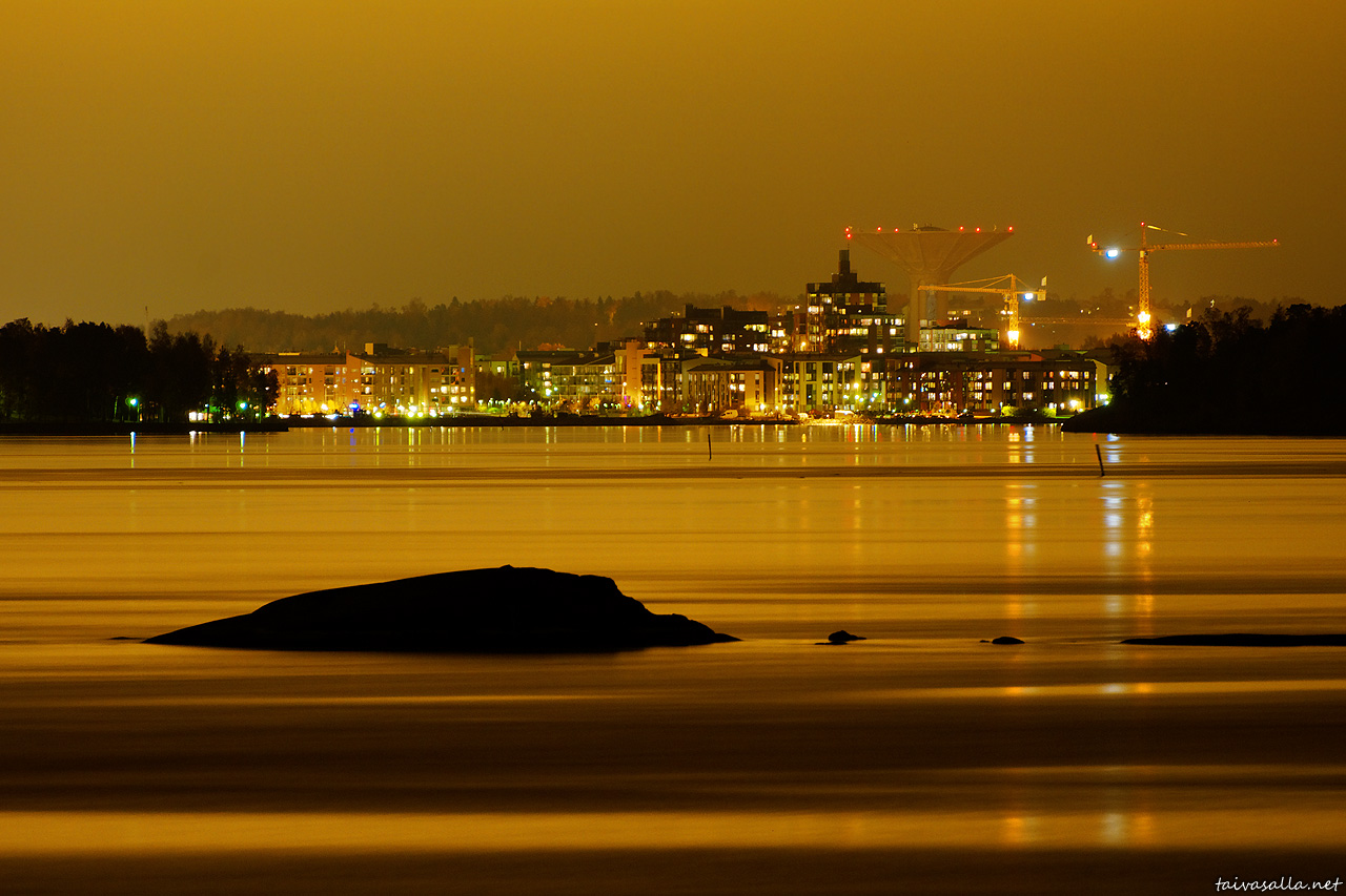Kylläpä näyttää upealle tämä kotikaupunginosa iltavalaistuksessa meren puolelta!