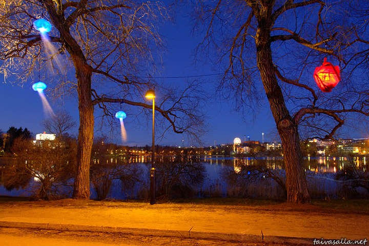 Helsinki: Lantern Park -valoteokseen kuuluvia lyhtyjä Töölönlahden eteläisellä rannalla osana Lux Helsinki -kaupunkitapahtumaa, joka aiempina vuosina tunnettiin nimellä Valon vuodenaika.
