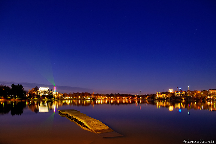 Helsinki: Näkymä pohjoiseen Töölönlahden rannalta Finlandia-talon kupeesta iltahämärissä. Olympiastadionin tornia koristaa Variant Spectrum vihreine lasersäteineen, yksi Lux Helsinki -kaupunkitapahtumaan kuuluneista valoteoksista. Kuvan yläreunassa erottuu kuusi Otavan tähtikuvion seitsemästä tähdestä, ks. suuri kuva.