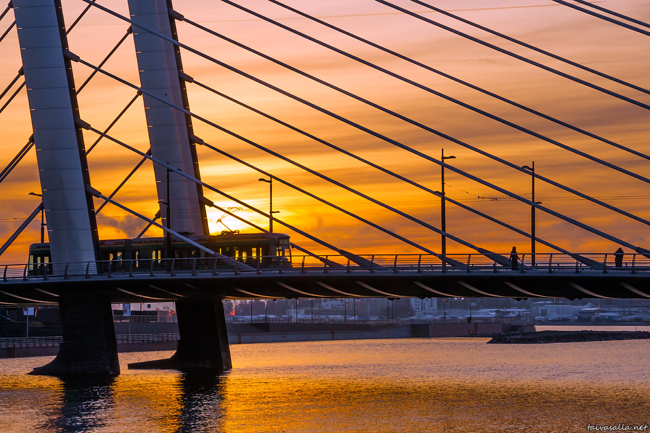 Helsinki: Crusellinsilta ja linjan 8 raitiovaunu matkalla Jätkäsaaresta Ruoholahteen uuden rataosuuden ensimmäisenä liikennöintipäivänä.