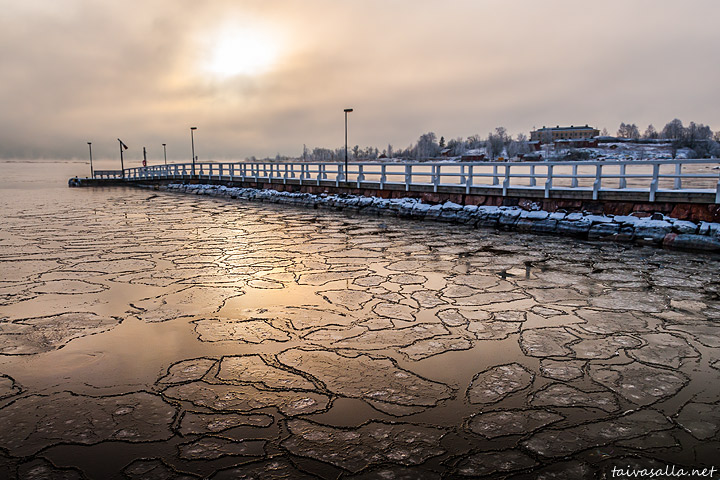 Helsinki: View from the frozen shore of Kaivopuisto district on a cold winter day.