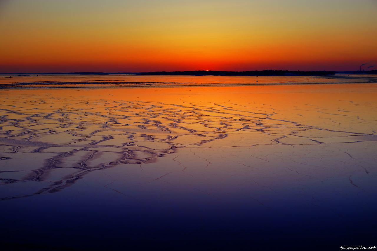 Helsinki: Auringonlaskun sävyttämä merinäköala Kustaanmiekan rantavallilta Suomenlinnasta. Aurinko on juuri katoamassa horisonttiin Melkin saaren taakse.
