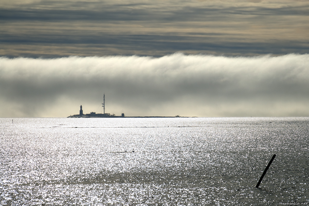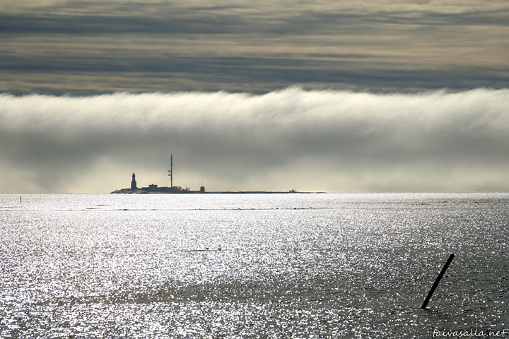 Helsinki: Fog drifting in from the Gulf of Finland, approaching the lighthouse island of Harmaja. Advection fog like this is a typical weather phenomenon near the coast during spring time, and it occurs when warm air passes over cool water.