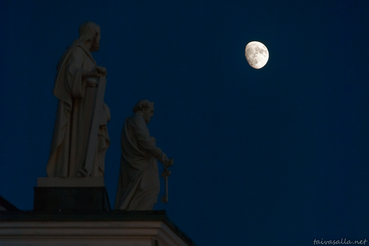 Helsinki: The waxing gibbous moon and two of the twelve apostle sculptures on the roof of the Lutheran Cathedral. Watching the moon in front is Simon the Zealot with a saw in his hand, on the right is Saint Peter with his keys, standing on the top of the western pediment.