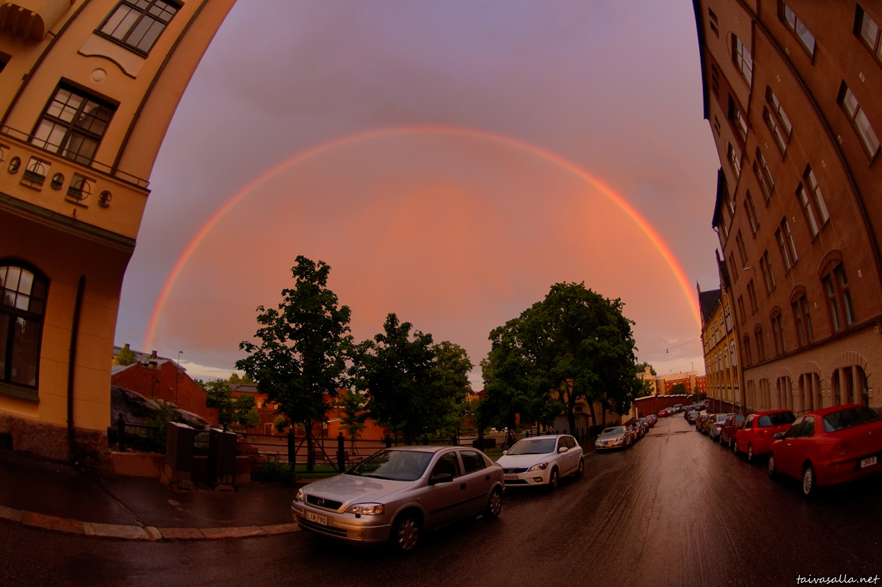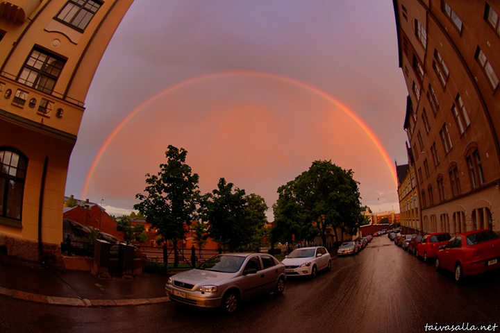 Helsinki: A rainbow in the evening sky seen from Vyökatu street in the district of Katajanokka.