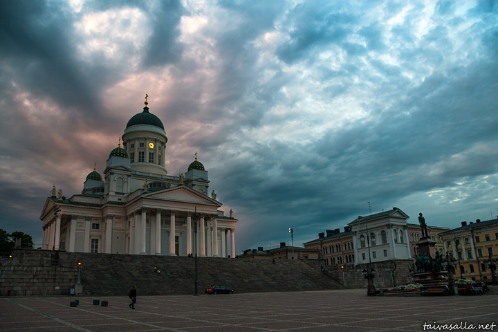 Only one person on so big square ? Why ? Not so late . In Cracov a lot of peple ( citizens and turists) feasting in open area at square till midnight, at summer time :). Finns put to beds very early :)