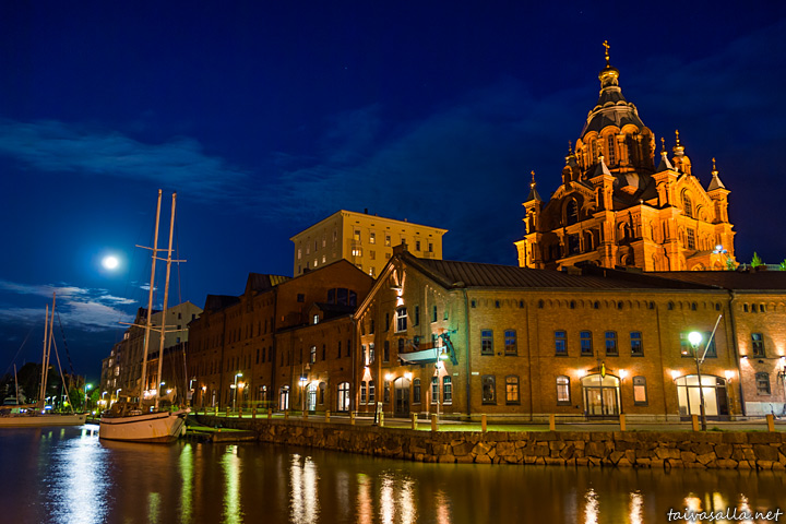 Helsinki: The full moon shining above the North Harbour and the northern shore of Katajanokka district. Rising above the old warehouse building on the right is the Uspenski Cathedral.