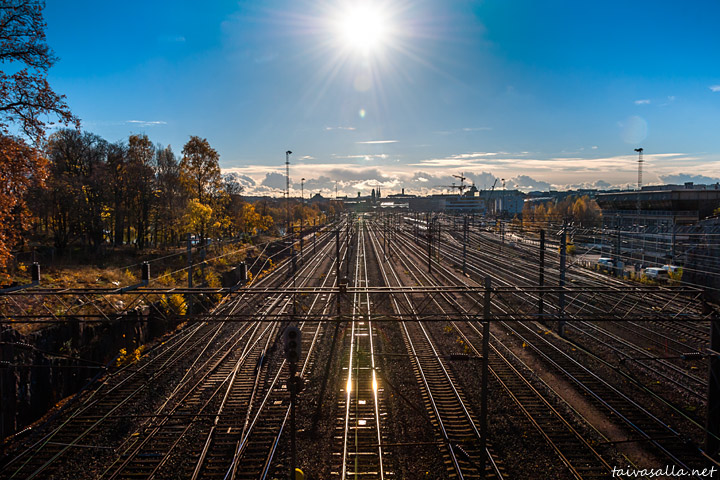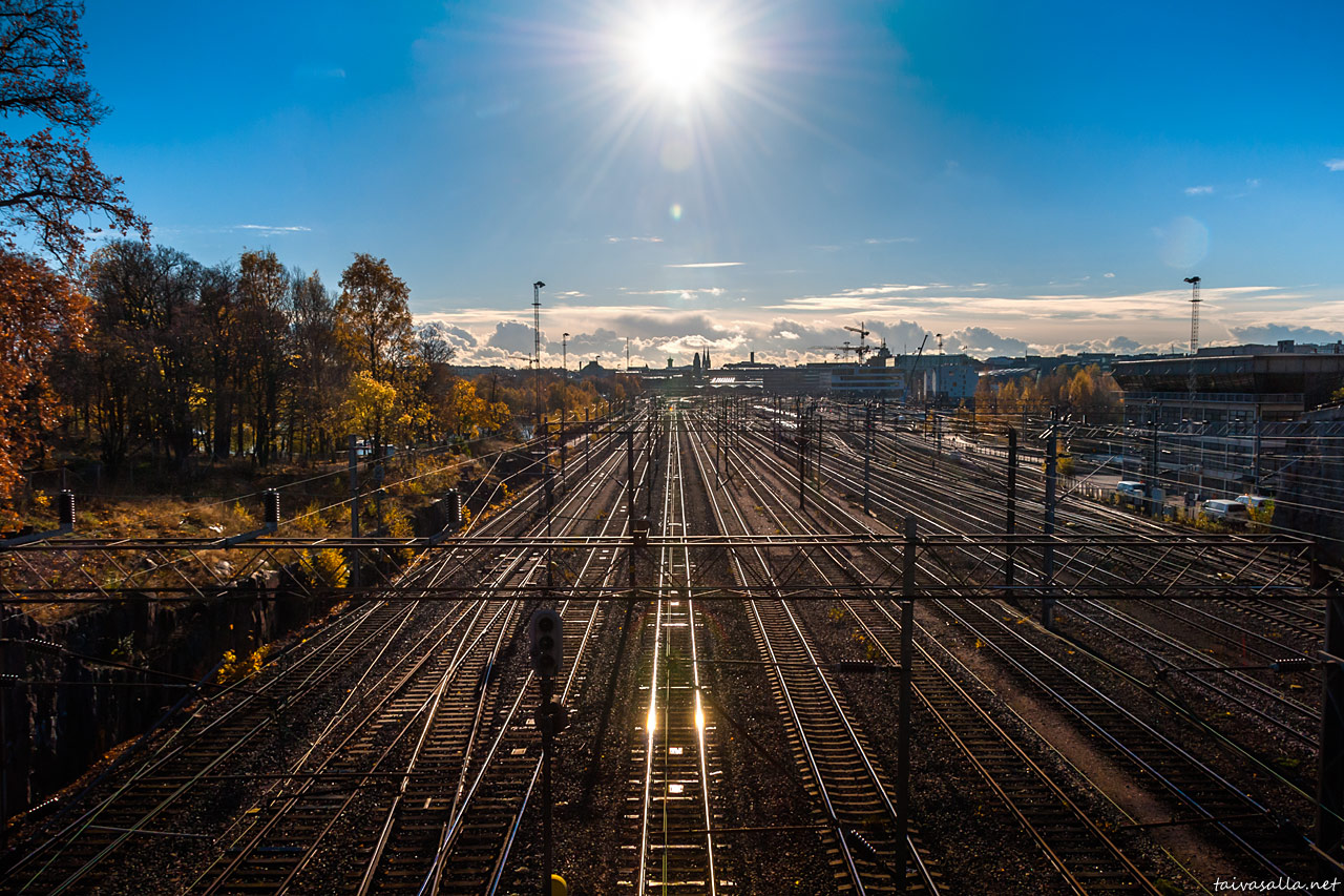 Helsinki: A midday view towards the Central Railway Station and the city centre from Linnunlaulu pedestrian bridge in the district of Kallio.