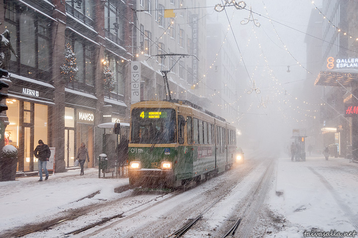 A tram under the Christmas lights on Aleksanterinkatu street in the city centre.