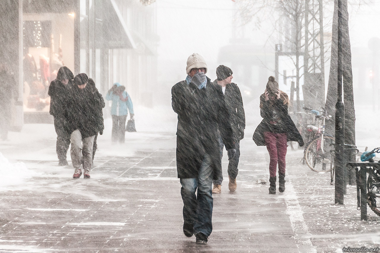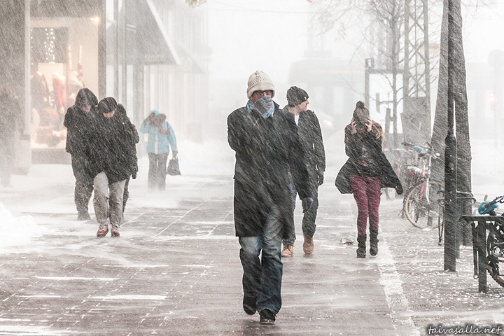 People walking in the blizzard on Mannerheimintie street in the city centre.