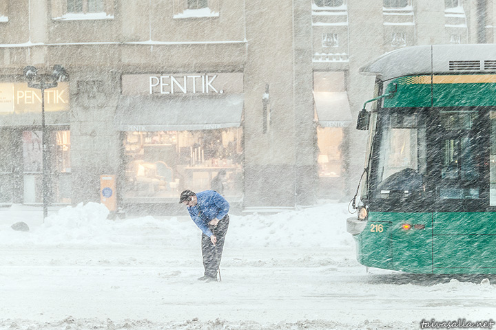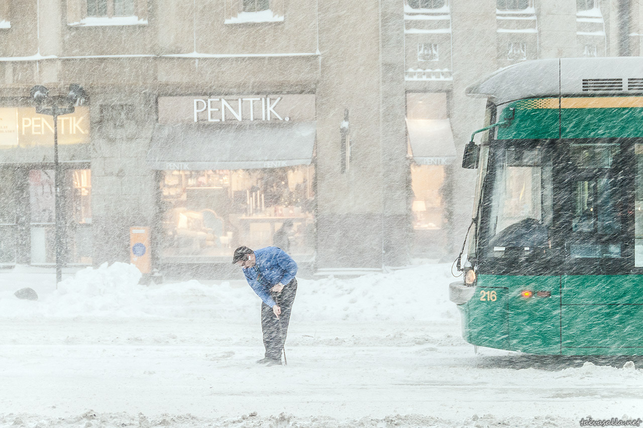 A tram driver cleaning a track switch on Mannerheimintie street in the city centre.
