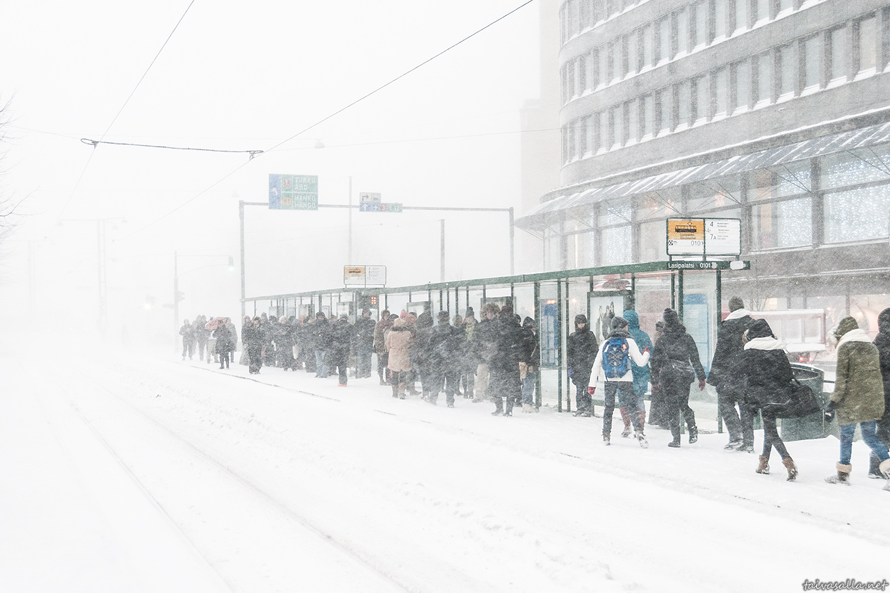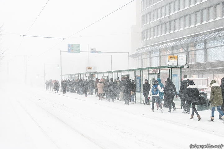 People waiting for the tram on Lasipalatsi stop on Mannerheimintie street in the city centre.