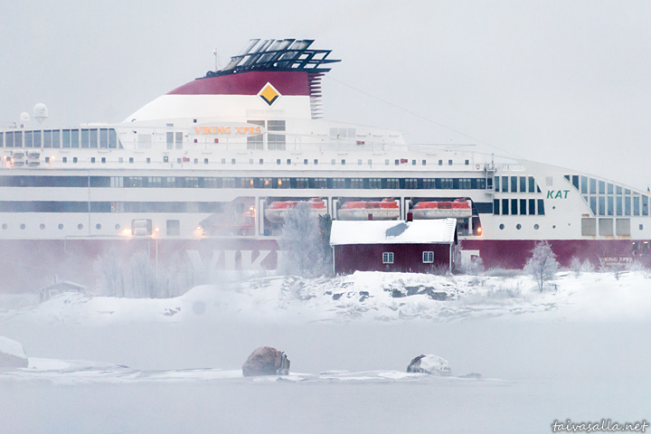 Helsinki: Viking XPRS passes the small Ryssänsaari island located near the South Harbour. View from the shore of Kaivopuisto on a cold winter morning.