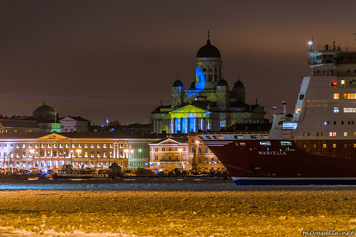 Helsinki: View over the South Harbour towards the Lutheran Cathedral during the annual Lux Helsinki event. Emergence, a video projection by Casa Magica, lights up the cathedral.