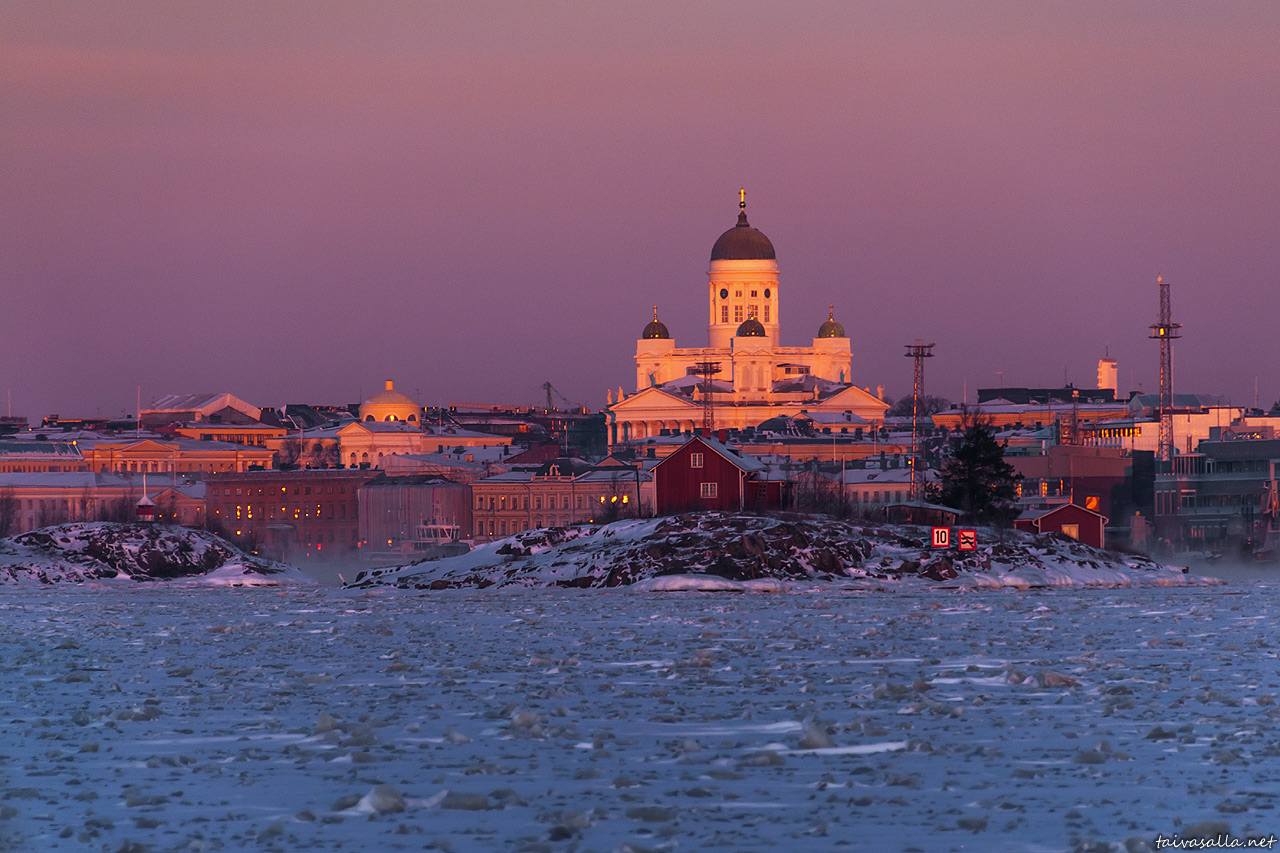 Helsinki: The Lutheran Cathedral glowing in the warm light of the sunrise on a cold morning. A small island near the South Harbour, Ryssänsaari, is seen in the front. Picture taken from a ferry approaching the Suomenlinna islands.