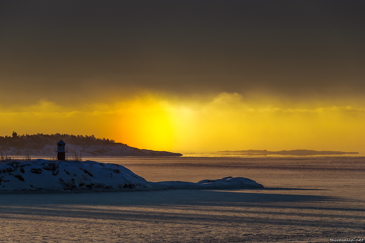 Helsinki: A sun dog (parhelion), a halo phenomenon caused by refraction of sunlight by ice crystals called diamond dust, glowing above the frozen sea on a very cold winter morning. View from Kustaanmiekka, the southernmost of the Suomenlinna islands.