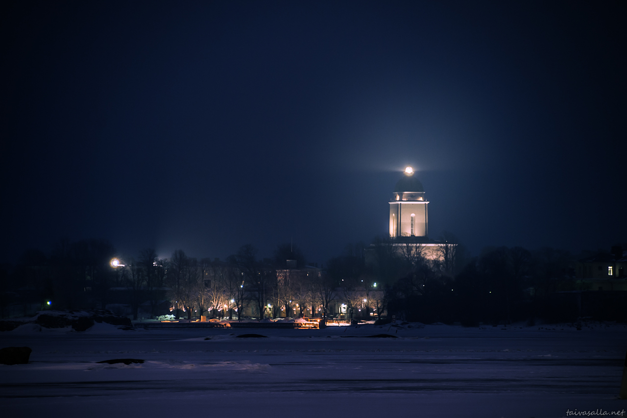 Helsinki: The lighthouse of Suomenlinna lights up the darkening winter evening in a view from the shore along Ehrenströmintie street in the district of Kaivopuisto.