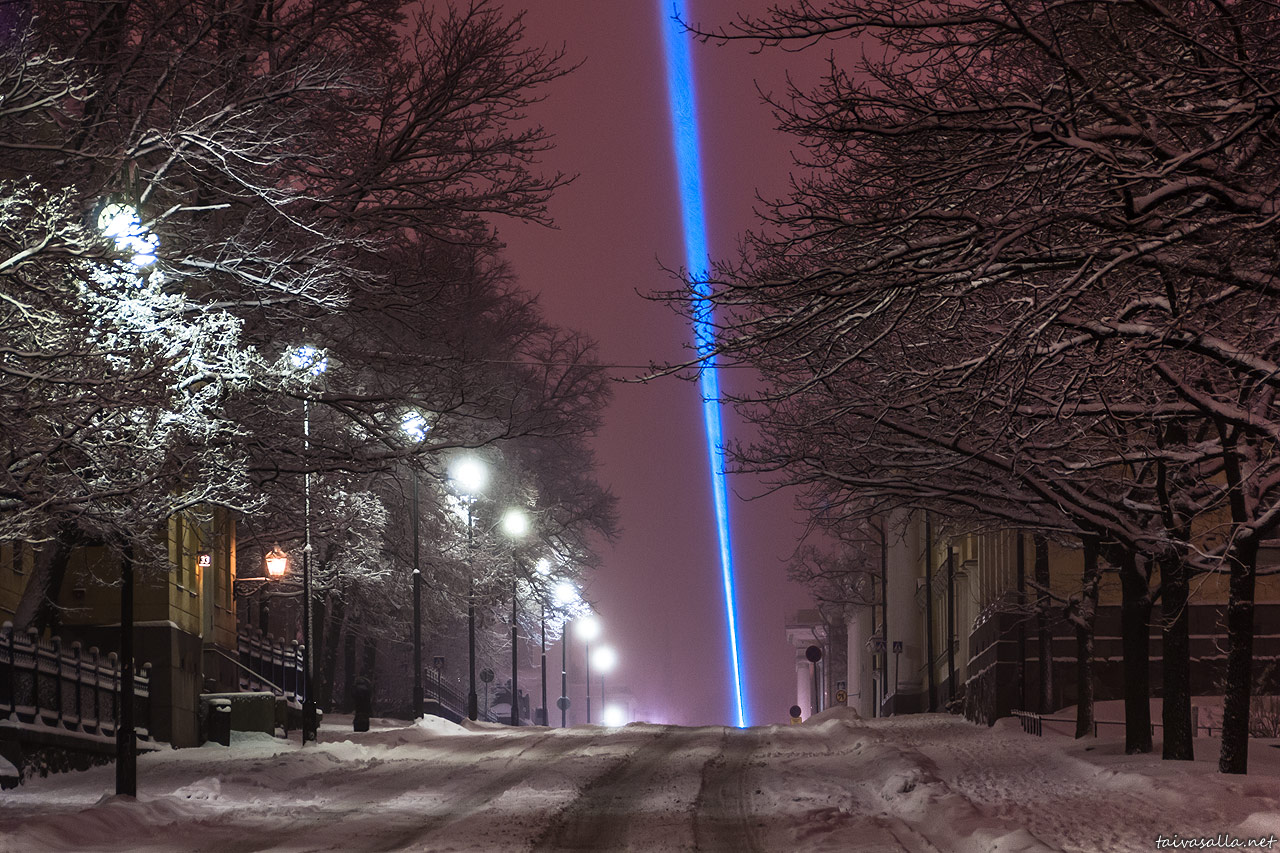 Helsinki: Blue Line, a laser light installation, glowing above Unioninkatu street on a snowy night. The laser beam lit in December 2012 marks the inner city's longest undivided street axis.