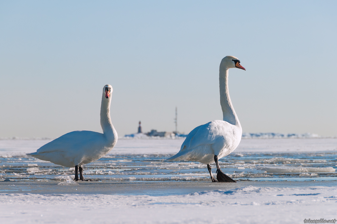 Helsinki: A mute swan couple walking on the frozen sea near the district of Kaivopuisto. The lighthouse island of Harmaja can be seen in the background.