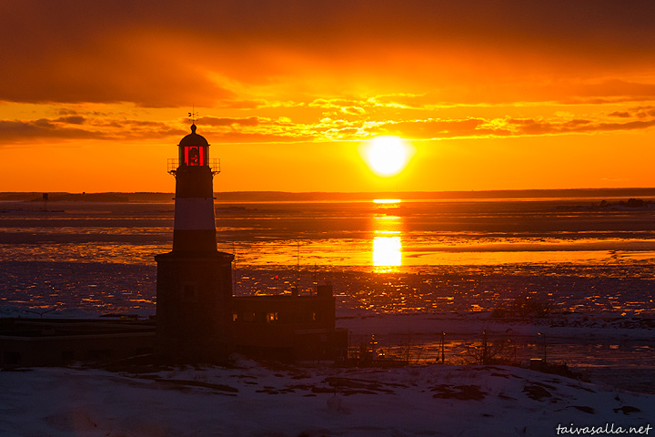Helsinki: Harmaja lighthouse island at sunset seen from a ferry passing by.