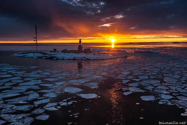 Helsinki: Harmaja lighthouse island at sunset seen from a ferry passing by.