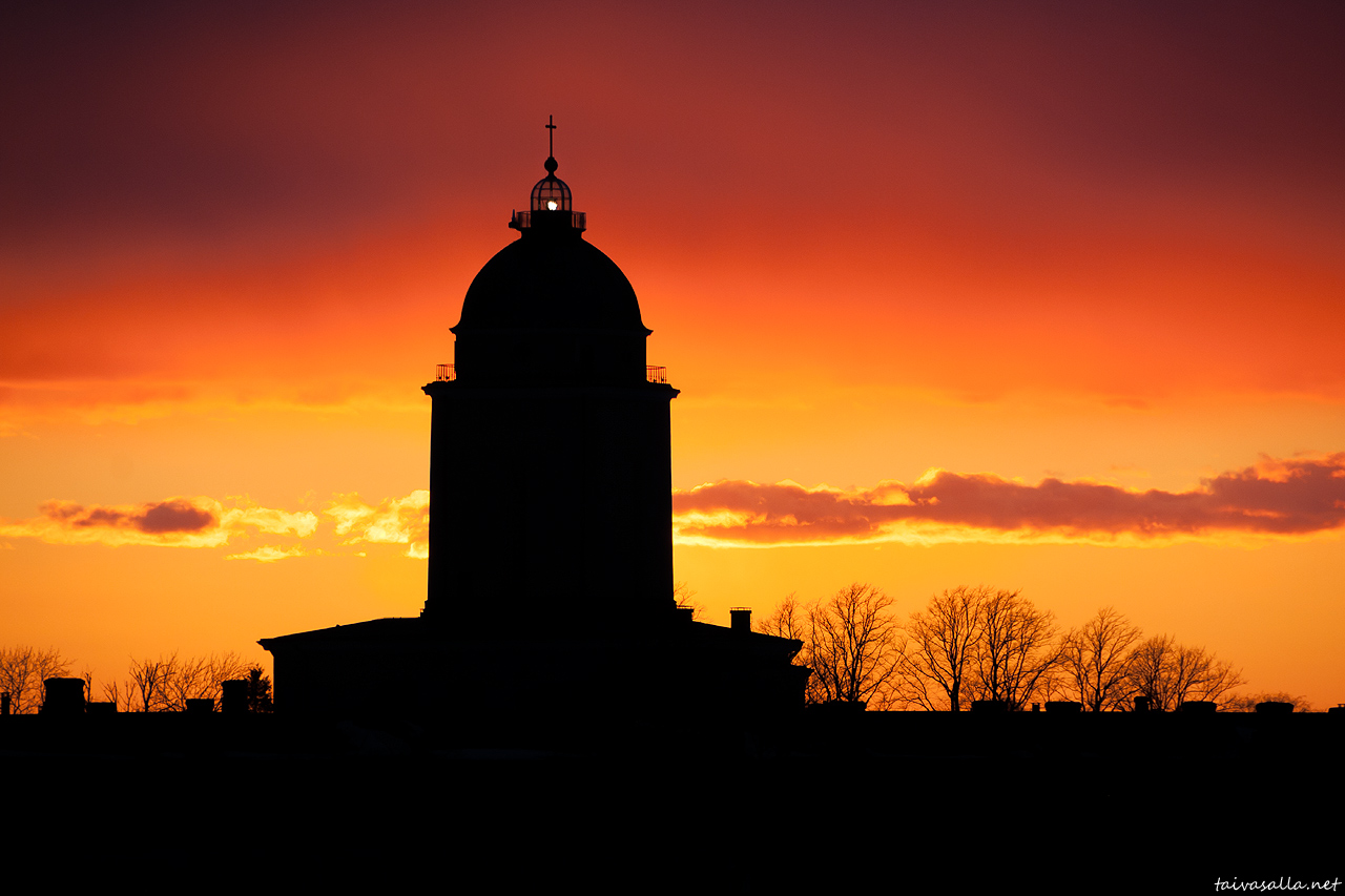 Helsinki: Suomenlinnan majakan siluetti auringonlaskun värjäämällä iltataivaalla.