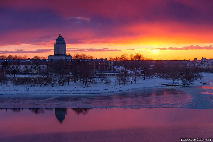 Helsinki: The lighthouse church of Suomenlinna and the eastern shore of Iso Mustasaari, one of the Suomenlinna fortress islands, seen from a ferry passing by at sunset.