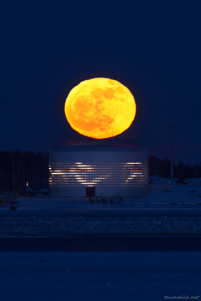 Helsinki: The full moon rises above Silo 468, an old oil tank transformed into a piece of light art. The silo, which is located on the shore of Laajasalo district, is here seen over the sea area of Kruunuvuorenselkä from the frozen North Harbour.