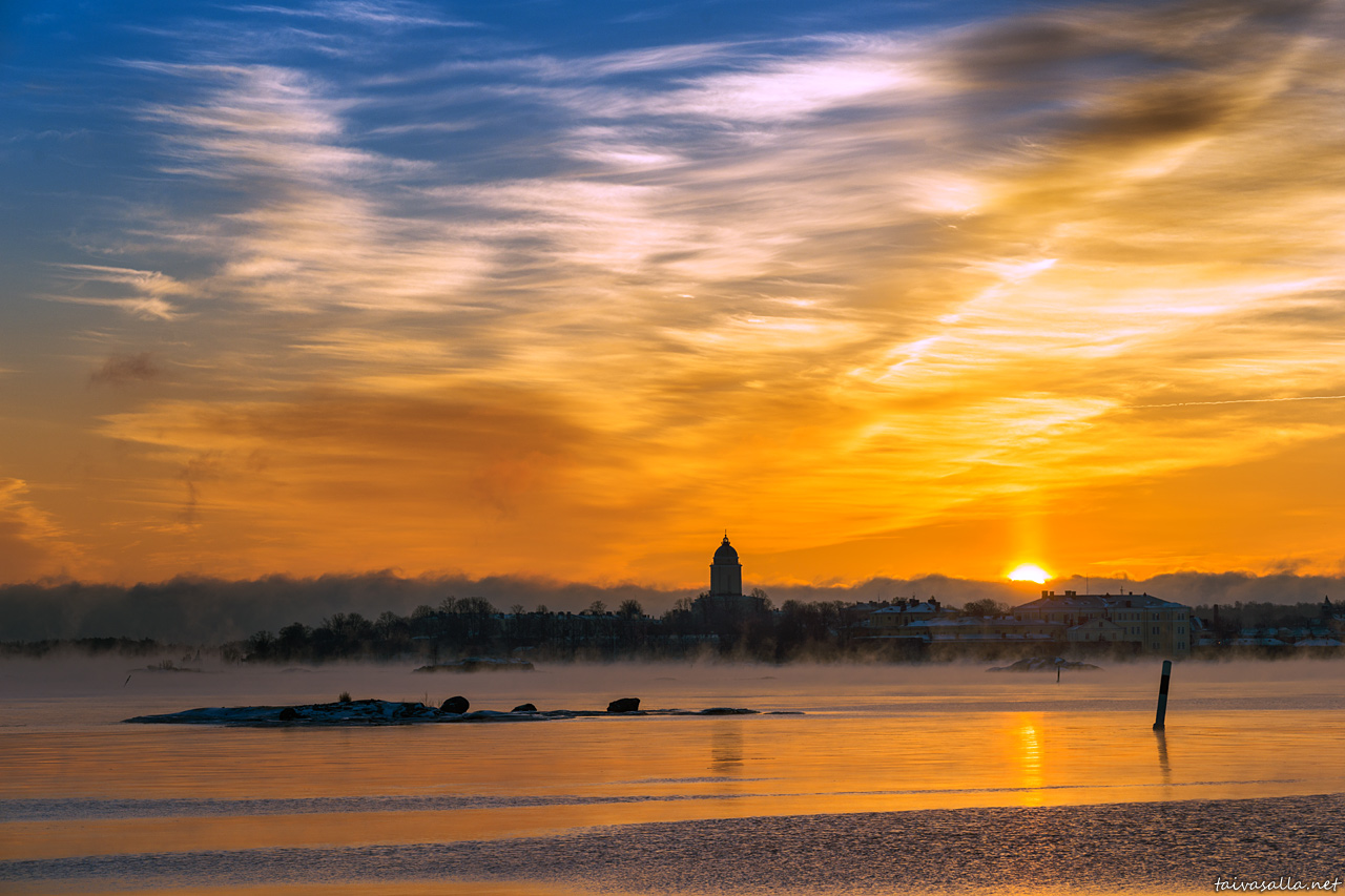 Helsinki: Aurinko nousee Suomenlinnan ylle kylmänä talviaamuna Ehrenströmintien varrelta Kaivopuiston rannasta kuvatussa näkymässä.