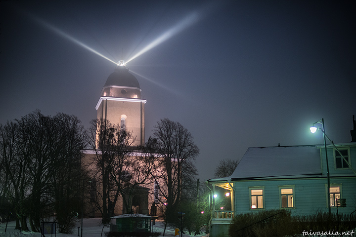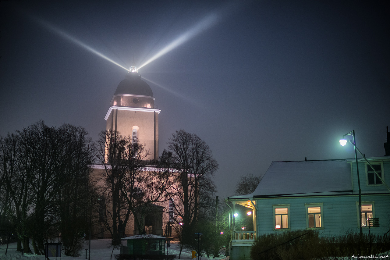 Helsinki: Suomenlinnan majakan valokeilat pyyhkivät utuista taivasta leutona talvi-iltana. Isossa Mustasaaressa sijaitsevan majakkakirkon nelisektorinen valo vilkuttaa pyöriessään neljää lyhyttä välkähdystä, jotka muodostavat morseaakkosten kirjaimen H kuten Helsinki.