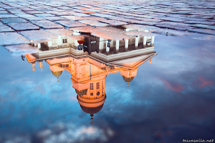 Helsinki: Helsinki Cathedral glowing in evening sunlight in a reflection view from the corner of Kirkkokatu and Unioninkatu streets.