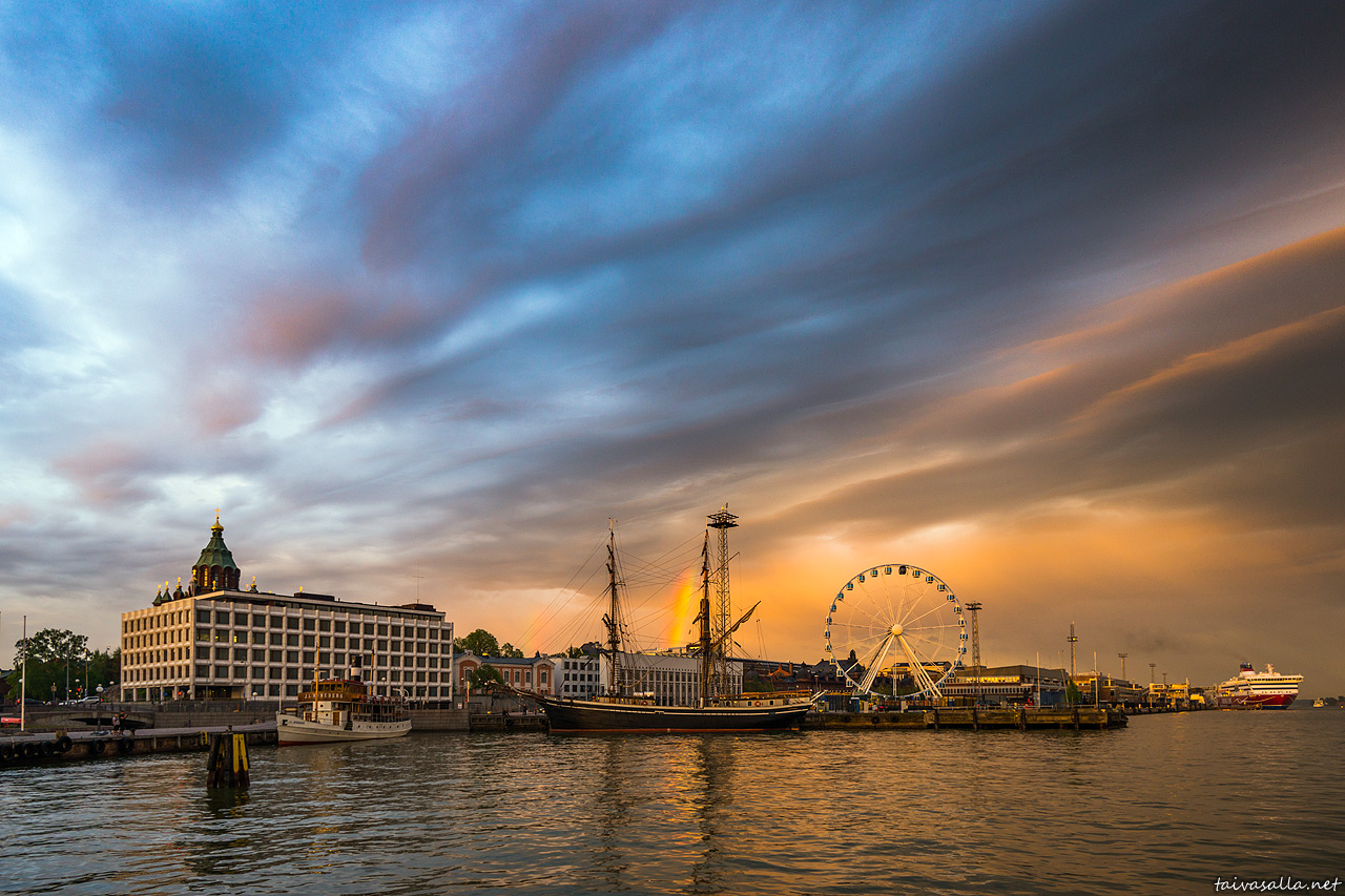 Helsinki: Rain clouds approaching the city in a spring evening's view from the shore of the Market Square towards the district of Katajanokka.