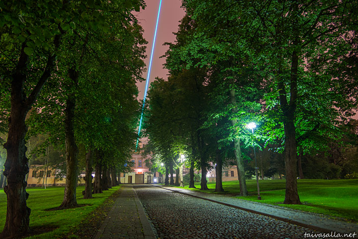 Helsinki: The Blue Line, a laser light installation, glowing above Kopernikuksentie street on a misty autumn evening. The laser beam marks the inner city's longest undivided street axis, extending from the roof of Helsinki Observatory to the tower of Kallio Church.