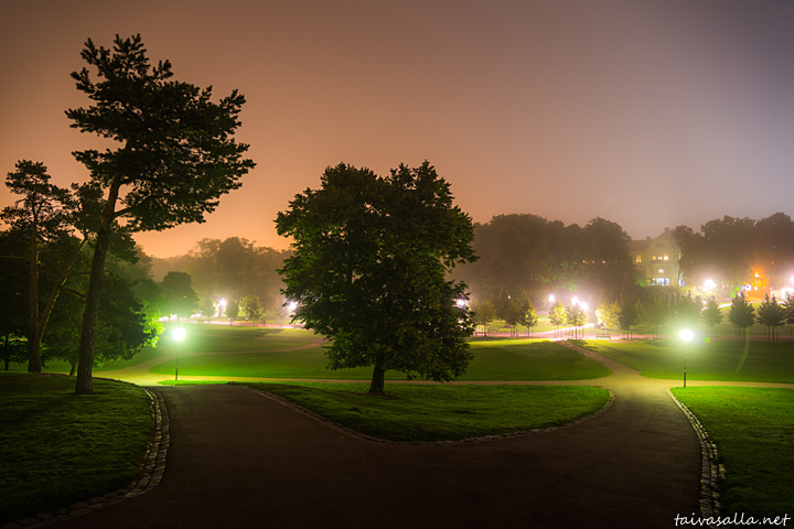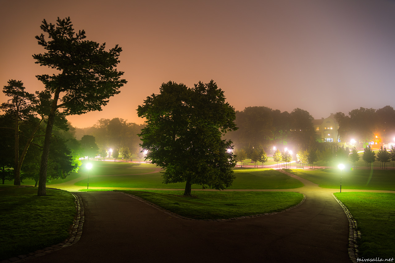 Helsinki: A desolate view from Kaivopuisto park on a foggy autumn night.