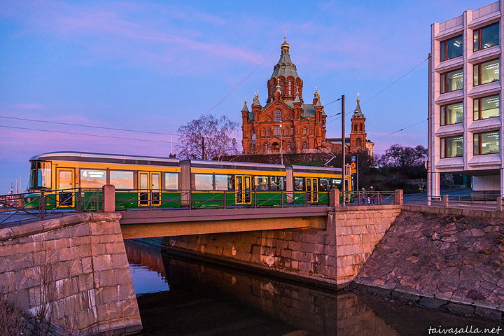 Helsinki: A new Artic tram passes the Uspenski Cathedral entering the district of Katajanokka. By 2018 there will be a total of 40 new trams in traffic.